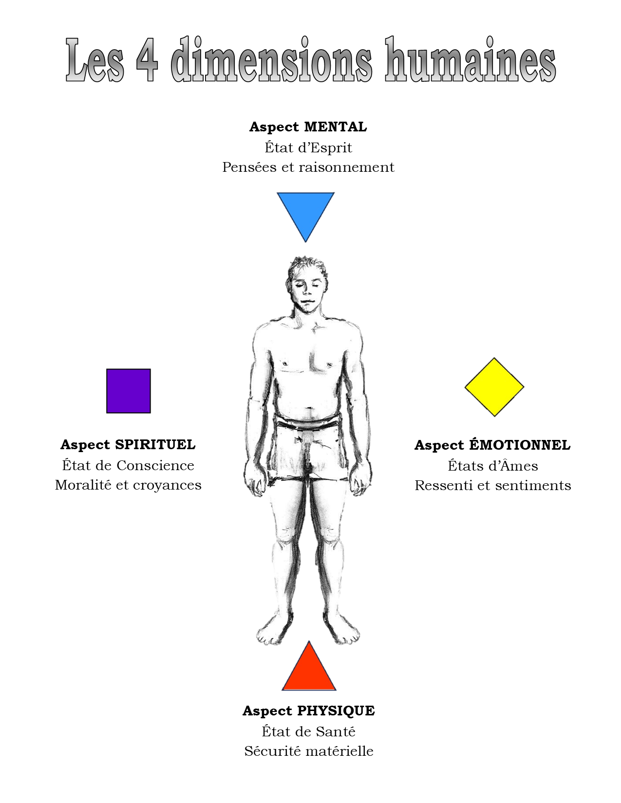 Ainsi, l’aspect PHYSIQUE est désigné par un TRIANGLE, car il réfère aux parties tangibles, concrètes et visibles de l’être, soit son côté « incarné », terre-à-terre. Toute son attention étant concentrée sur sa survie, il est normal que l’énergie se concentre plus dans le bas du CORPS que dans le haut; d’où la base « solide » du TRIANGLE.