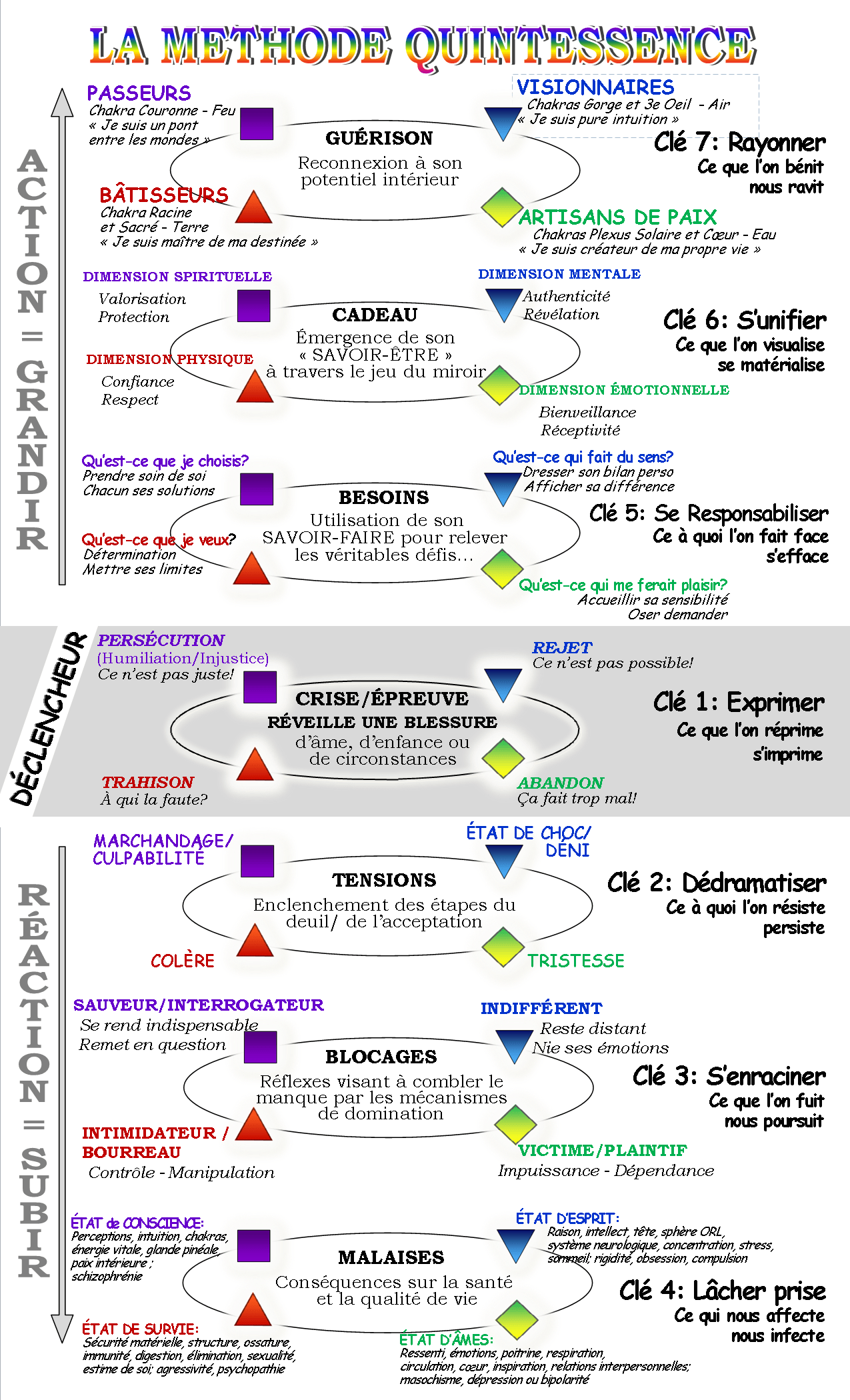 Le tableau ci-dessous présente de façon détaillée ce qu’il adviendra d’un individu s’il a l’impression de SUBIR des perturbations qui l’affligent ou si, au contraire, il décide plutôt de toute mettre en œuvre afin de rétablir l’harmonie à l’intérieur de soi et, ainsi, de GRANDIR dans la pleine reconnaissance de lui-même.